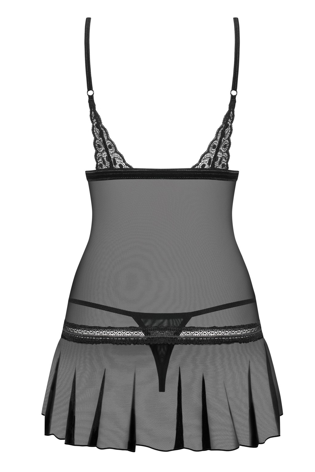 Seksowna koszulka wykonana z delikatnej siateczki. Regulowane ramiączka – możliwość dopasowania. Geometryczna koronka na biuście – ładnie podkreślone piersi. Elegancka, ozdobna zawieszka – jeszcze więcej kobiecego uroku. Kusząca przezroczystość materiału. Zalotne marszczenie na dole koszulki. Zestaw zawiera koszulkę i stringi.