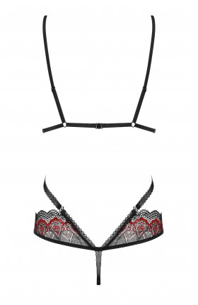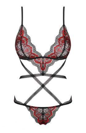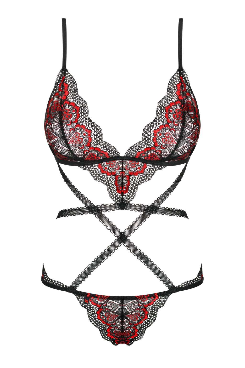 Seksowne body o geometrycznym kroju. Lekki, koronkowy materiał. Miseczki o kształcie trójkąta. Regulowane ramiączka – komfort noszenia. Regulowane zapięcie – idealne dopasowanie do każdej sylwetki. Krzyżujące się paski na brzuchu są połączone ze stringami za pomocą zapinek – ułatwienie podczas zakładania. Delikatny i elastyczny materiał Multistretch.