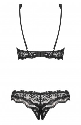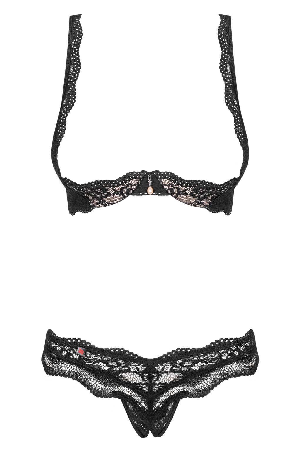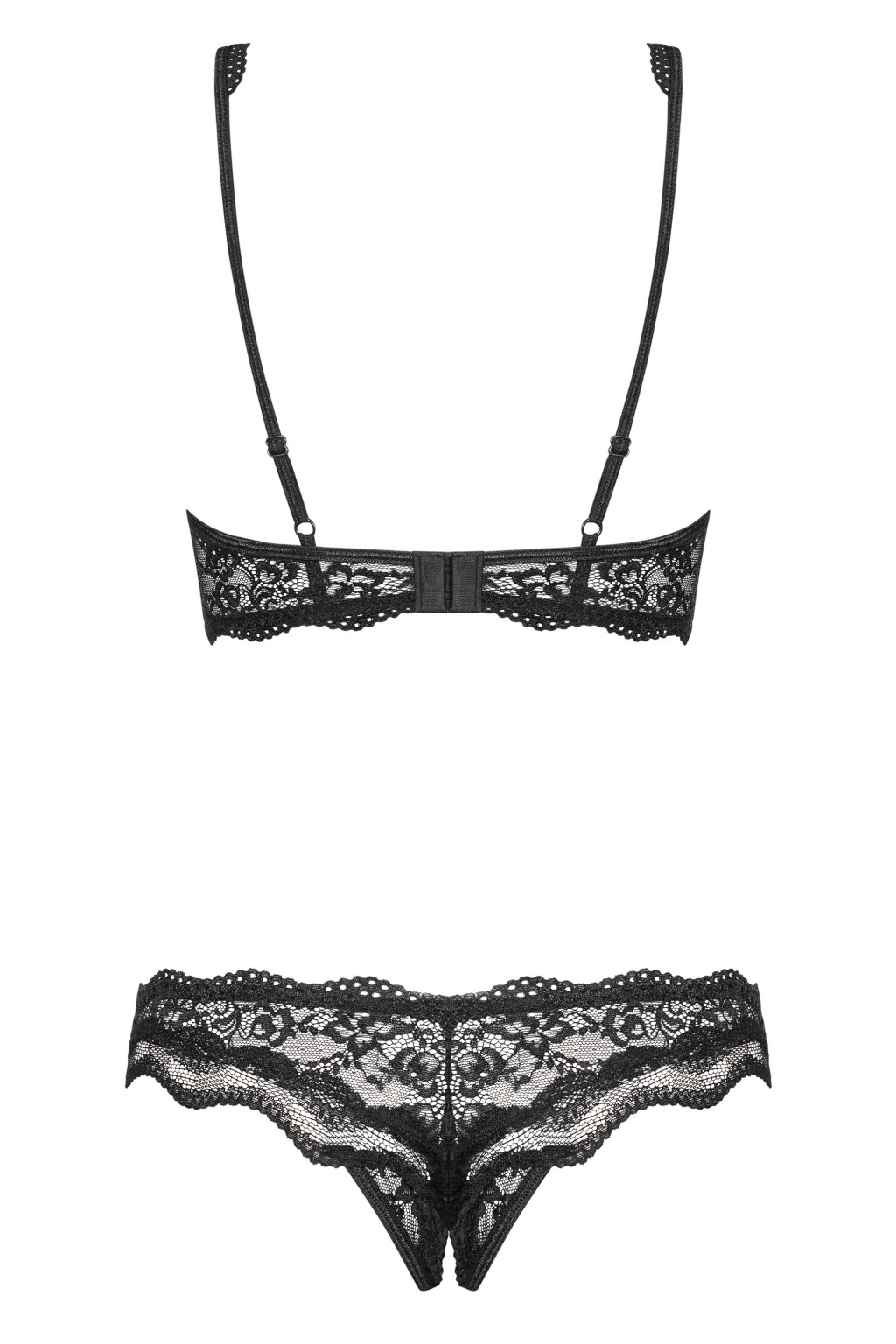 Czarny komplet Luvae. Otwarty biustonosz z biżuteryjnym elementem i koronką – doda pikanterii. Miseczki z fiszbinami i usztywnieniem – podtrzymanie biustu. Zdobione, regulowane ramiączka i zapięcie – możliwość dopasowania. Koronkowe stringi z otwartym krokiem – gwarancja miłosnych doznań i piękny wygląd pośladków. Elastyczny i miękki materiał Multistretch.