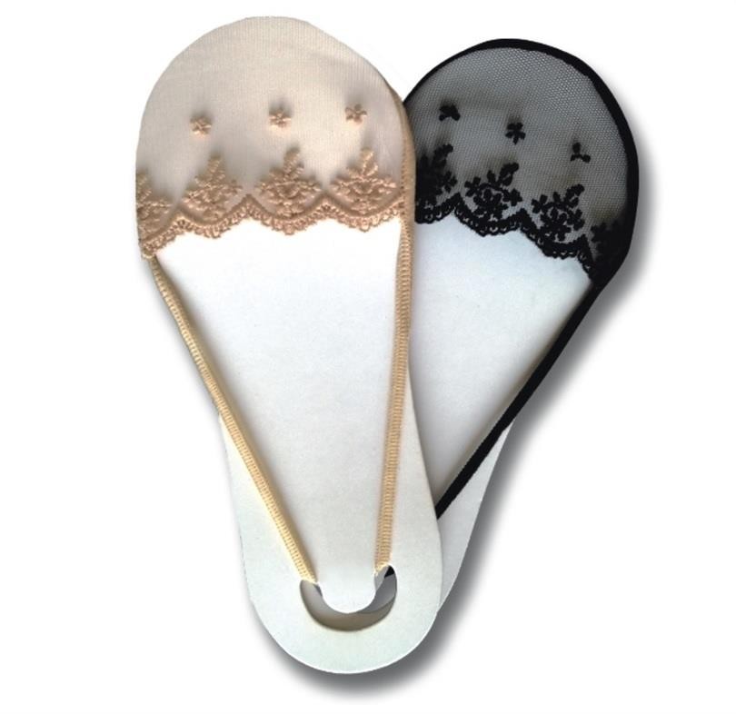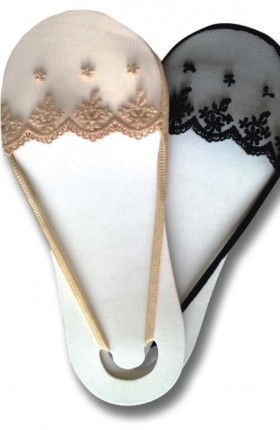 Stopki damskie, które nie posiadają zabudowanej pięty to idealny wybór do modnych butów bez pięt lub zapinanych wokół kostki. Część palcowa jest bardzo cienka, niemal niewidoczna i została wykończona koronką z delikatnym motywem. Stopki zabezpieczają palce oraz podbicie stopy przed otarciami oraz odparzeniami.