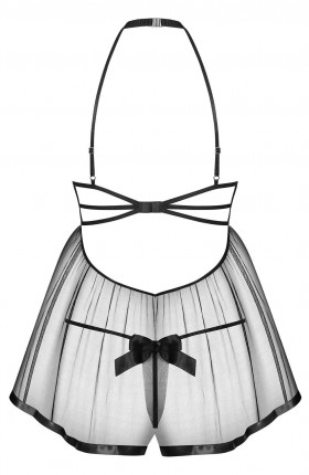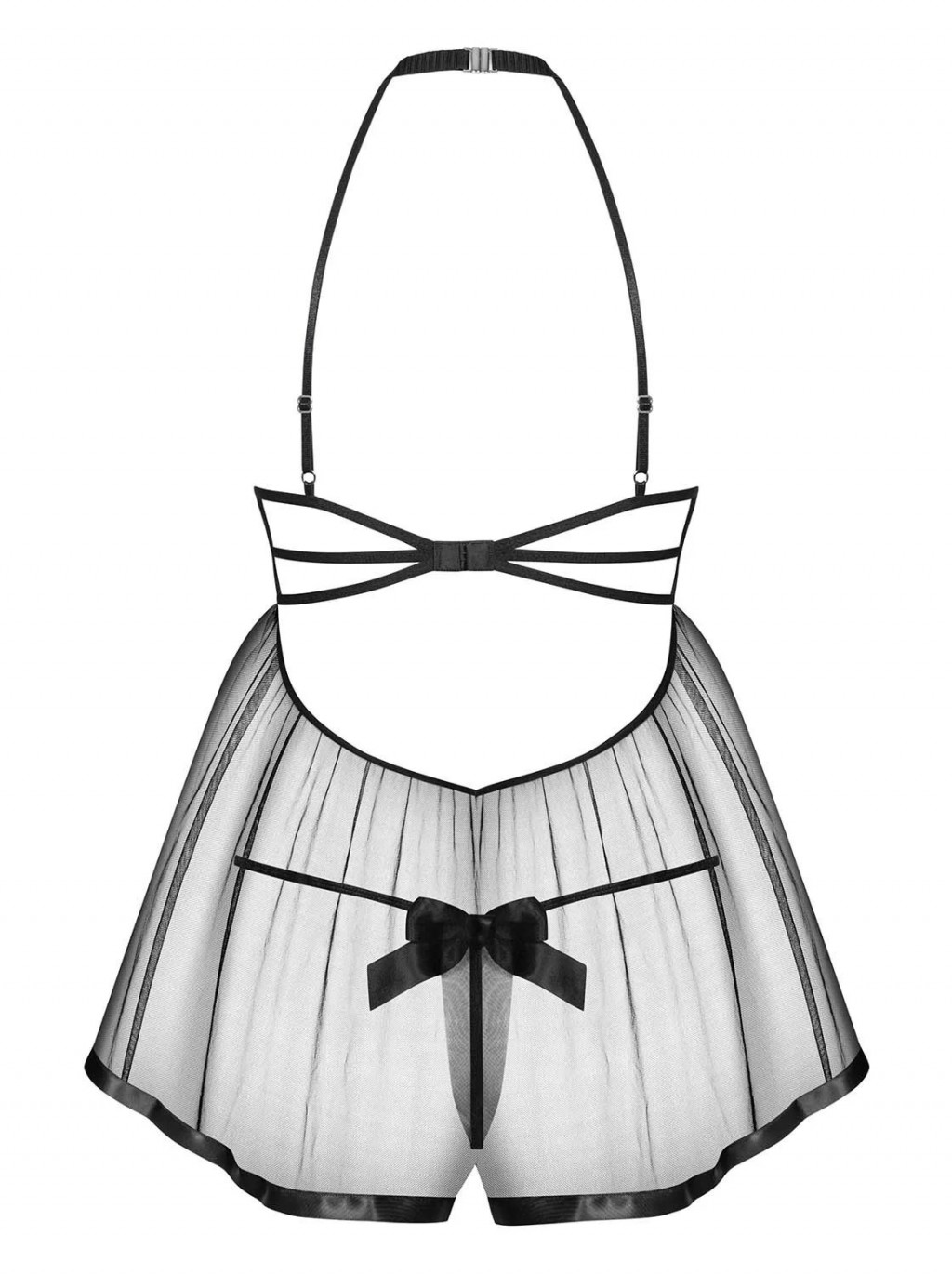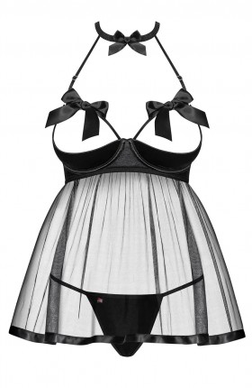 Niesamowita babydoll – dodaje uroku i pikanterii! Paseczek w stylu chokera zapinany na szyi – wyjątkowo uroczy i pobudzający. Kilkustopniowe zapięcie z tyłu plus elastyczne paski zdobiące plecy. Regulowane ramiączka – możliwość perfekcyjnego dopasowania. Otwarty biustonosz z ozdobnymi kokardkami – przyciąga wzrok do ładnie wyeksponowanego biustu. Usztywniane miseczki i fiszbiny – pełne podkreślenie piersi. Seksowny, błyszczący materiał pod biustem zjawiskowa, prześwitująca tkanina na dole. Zestaw zawiera babydoll i zdobione stringi. Przyjemny, delikatny materiał.