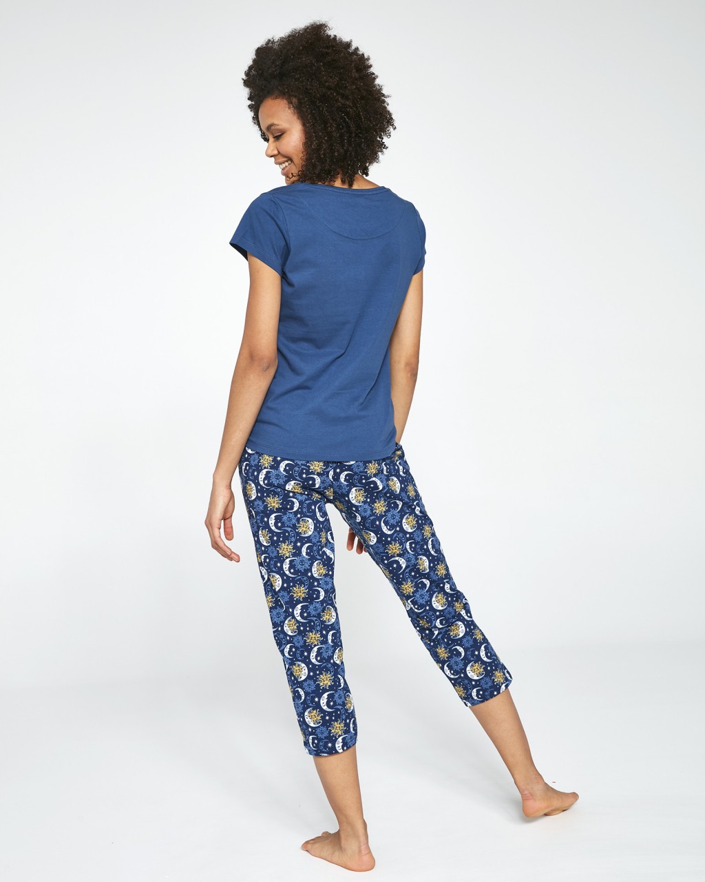 Wygodna piżama damska na lato, wykonana z wysokiej jakości bawełny. Materiał jest miły w dotyku i co najważniejsze, delikatny dla skóry, pozwala jej swobodnie oddychać. Koszulka z krótkim rękawem w kolorze jeansu została ozdobiona drobnym nadrukiem księżyca i gwiazd. Nadruk z delikatnym połyskiem nadaje jej stylu. Wygodne spodnie 7/8 z niezwykle stylowym nadrukiem księżyców i gwiazd podkreśla wyjątkowość zestawu. Spodnie zostały ozdobione subtelną kokardką. Ten wyjątkowy zestaw piżamowy jest niezwykle wygodny, zapewnia pełną swobodę ruchów podczas snu. Został zapakowany w estetyczne pudełeczko, sprawdzi się również jako prezent.