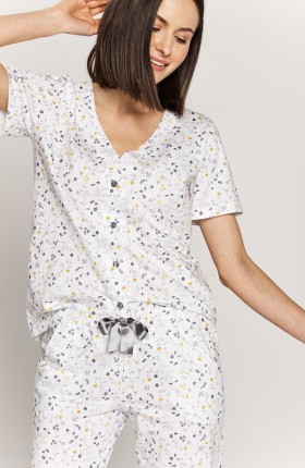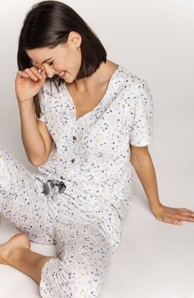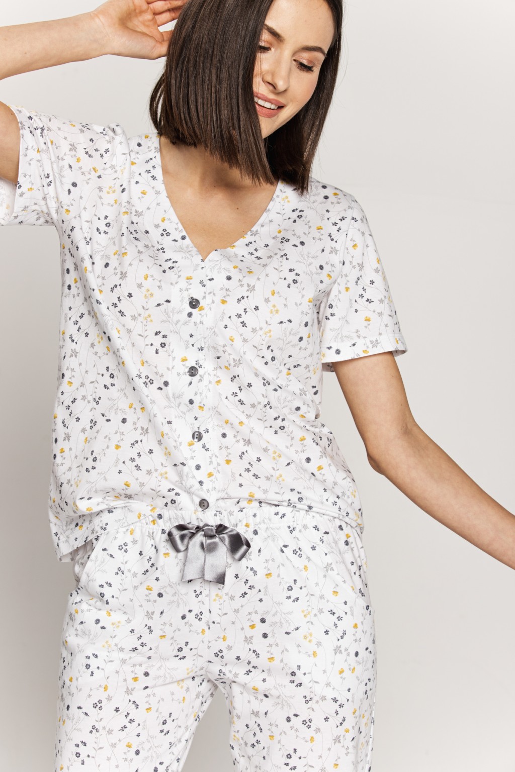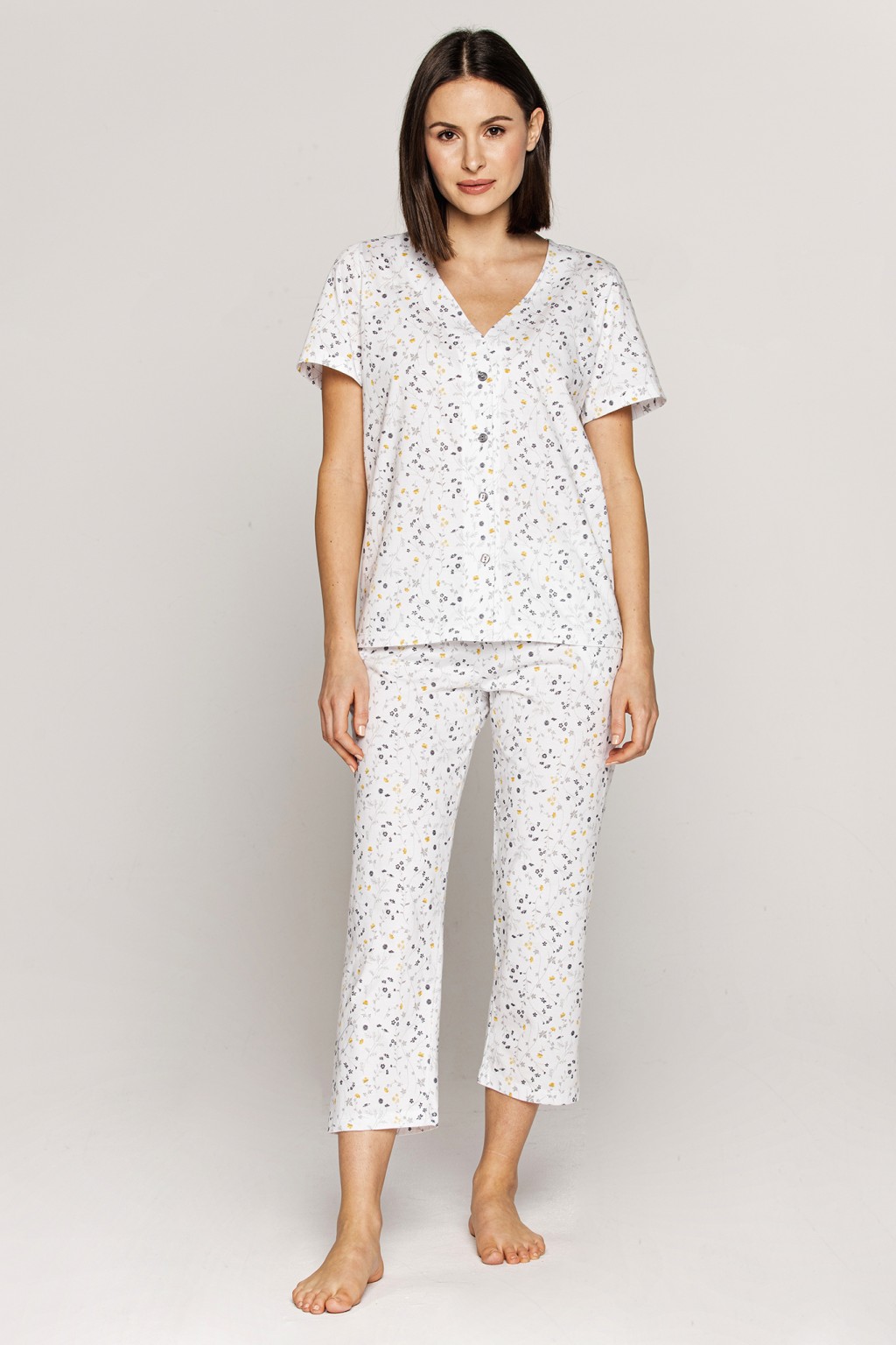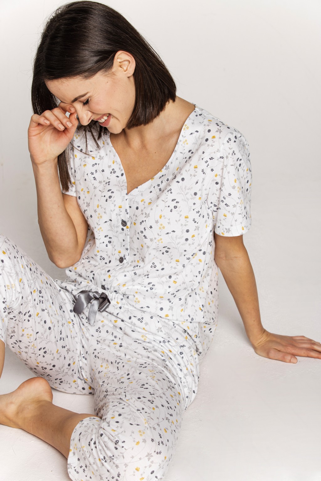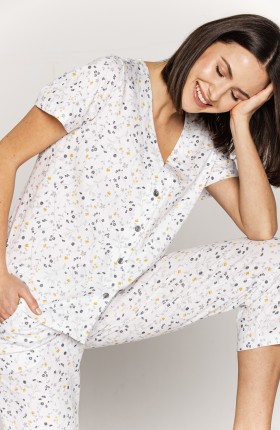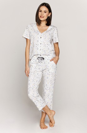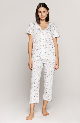 Subtelna piżama damska uszyta z wysokiej jakosci wzorzystej bawełny w delikatne kwiaty. Koszulka w serek z krótkim rękawem rozpinana po długości. Do kompletu spodnie o długości 7/8 z kieszeniami.