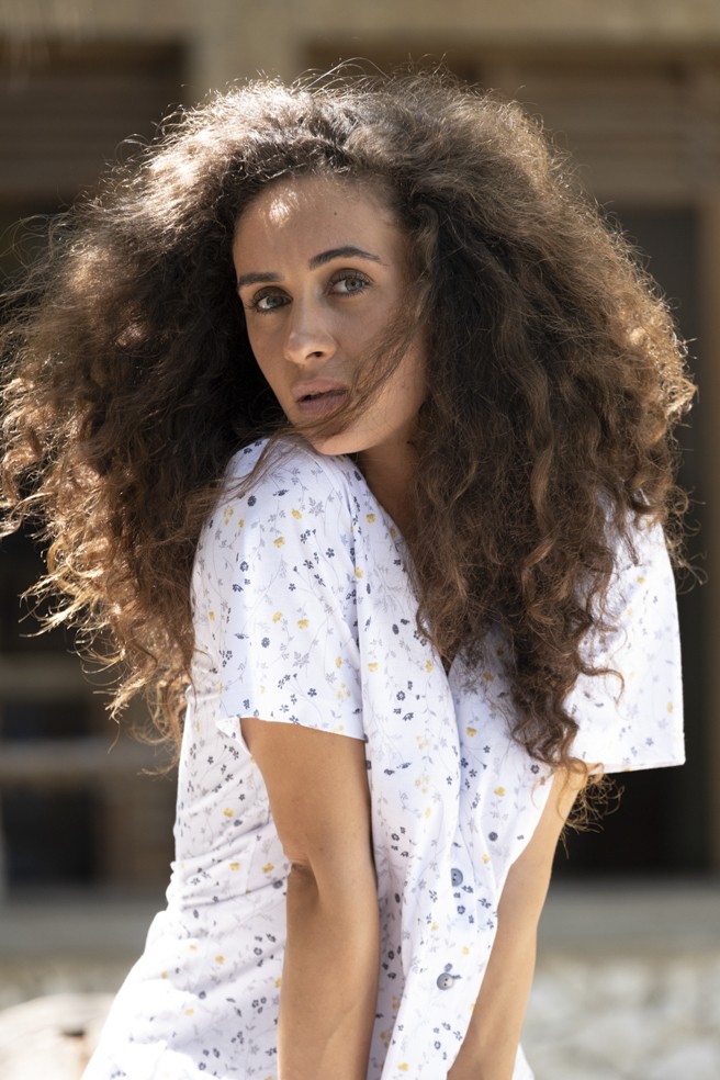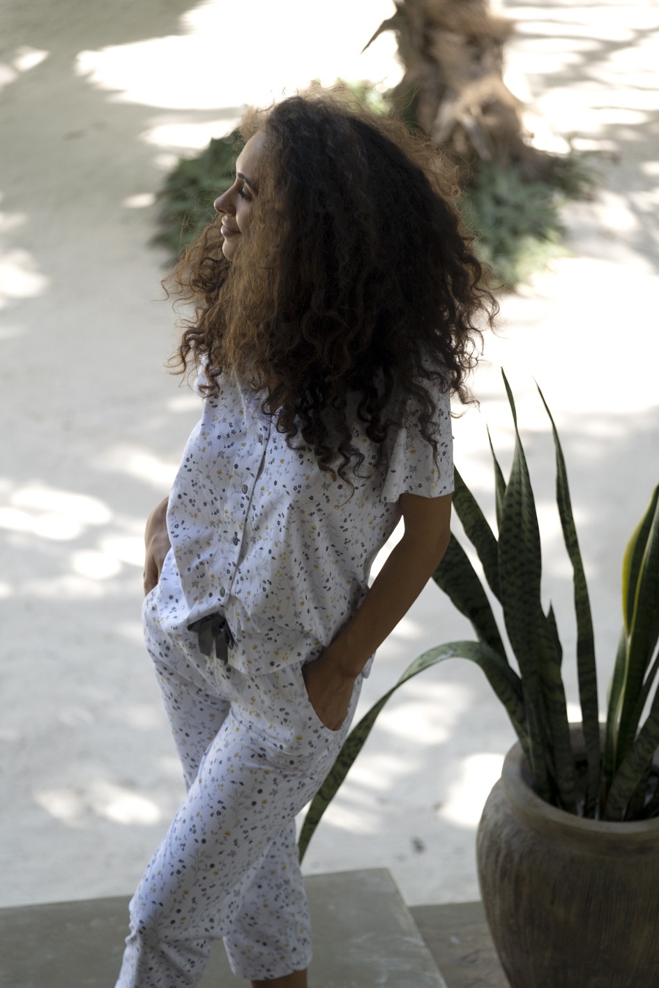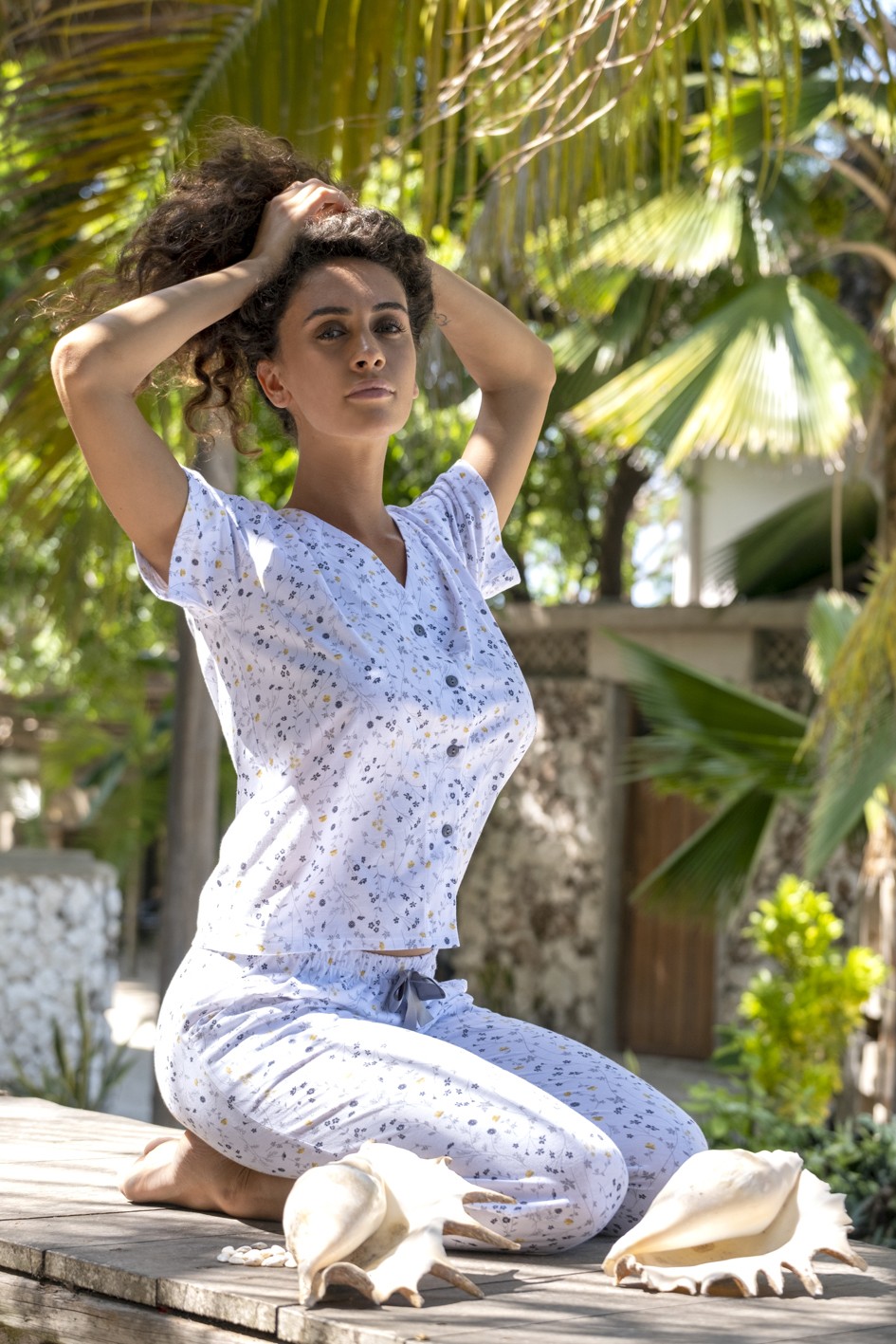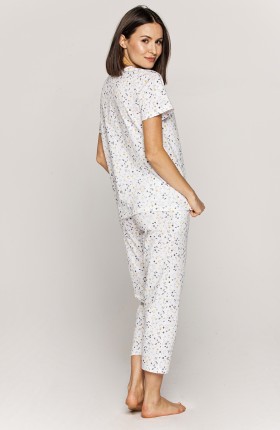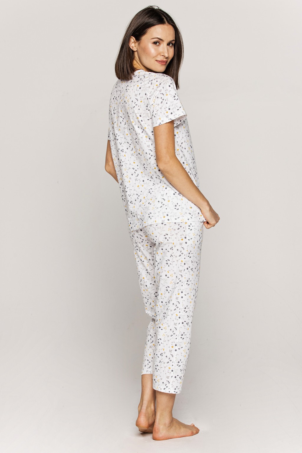 Subtelna piżama damska uszyta z wysokiej jakosci wzorzystej bawełny w delikatne kwiaty. Koszulka w serek z krótkim rękawem rozpinana po długości. Do kompletu spodnie o długości 7/8 z kieszeniami.