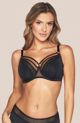 Biustonosz półusztywniany wykonany z pianki, koronki i siateczki. Do produkcji modelu wykorzystana została cienka pianka, dzięki której ładnie kształtuje się biust a jednocześnie jest niewyczuwalna. Konstrukcja biustonosza doskonale zbiera biust. Górna część miseczki wykończona w elegancki sposób koronką i siateczką. Dodatkowo umieszczono ozdobne ramiączka ze złotymi kółeczkami i regulatorami. Boczki wykonane z siateczki wykończone gumką. Posiada regulowane, nieodpinane ramiączka. Zapinany na podwójną haftkę. Forma 854.