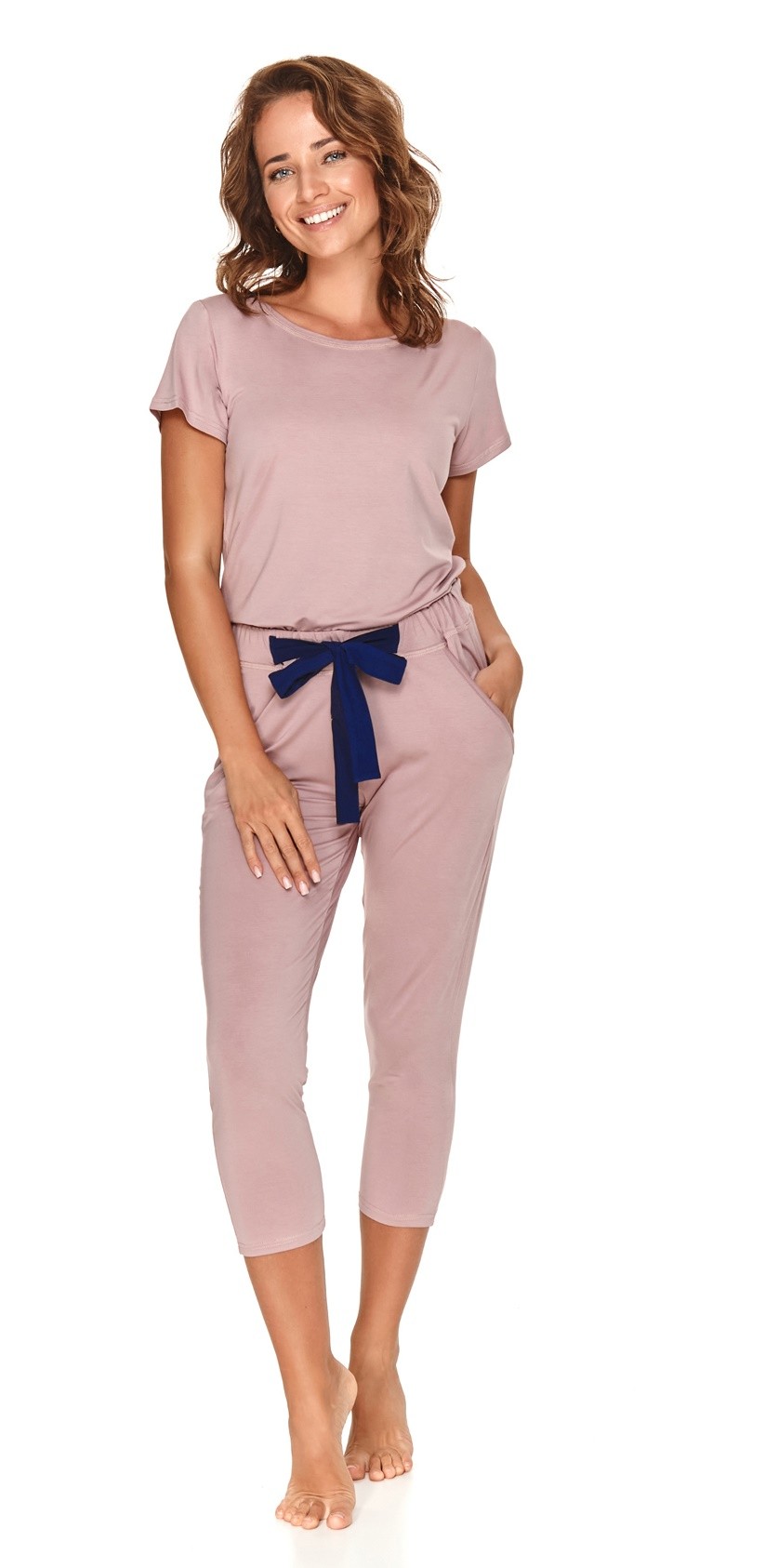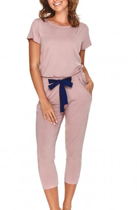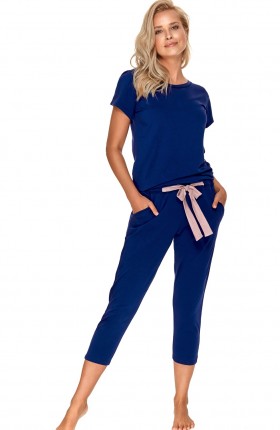 Efektowna damska piżama wykonana z przyjemnej wiskozy. Jednolita bluzka z krótkim rękawem, do kompletu spodnie 7/8 z dodającą uroku satynową kokardą w pasie.