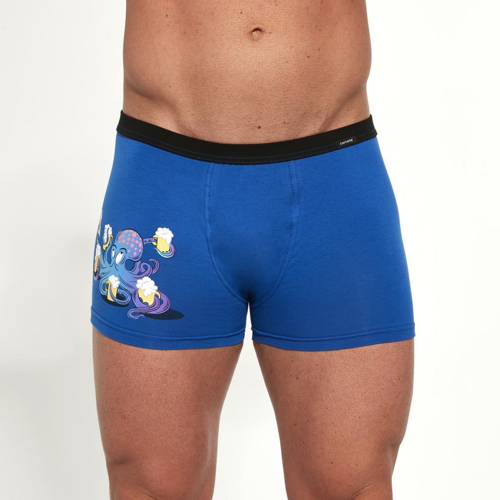 Kobaltowe bokserki męskie z wysokiej jakości wzorzystej bawełny, ozdobione kolorowym nadrukiem w kształcie ośmiornicy. Dopasowane, płaskie szwy, wygodna guma w pasie obszyta bawełną, bezuciskowe wykończenie nogawek. Bokserki pakowane w pudełko.