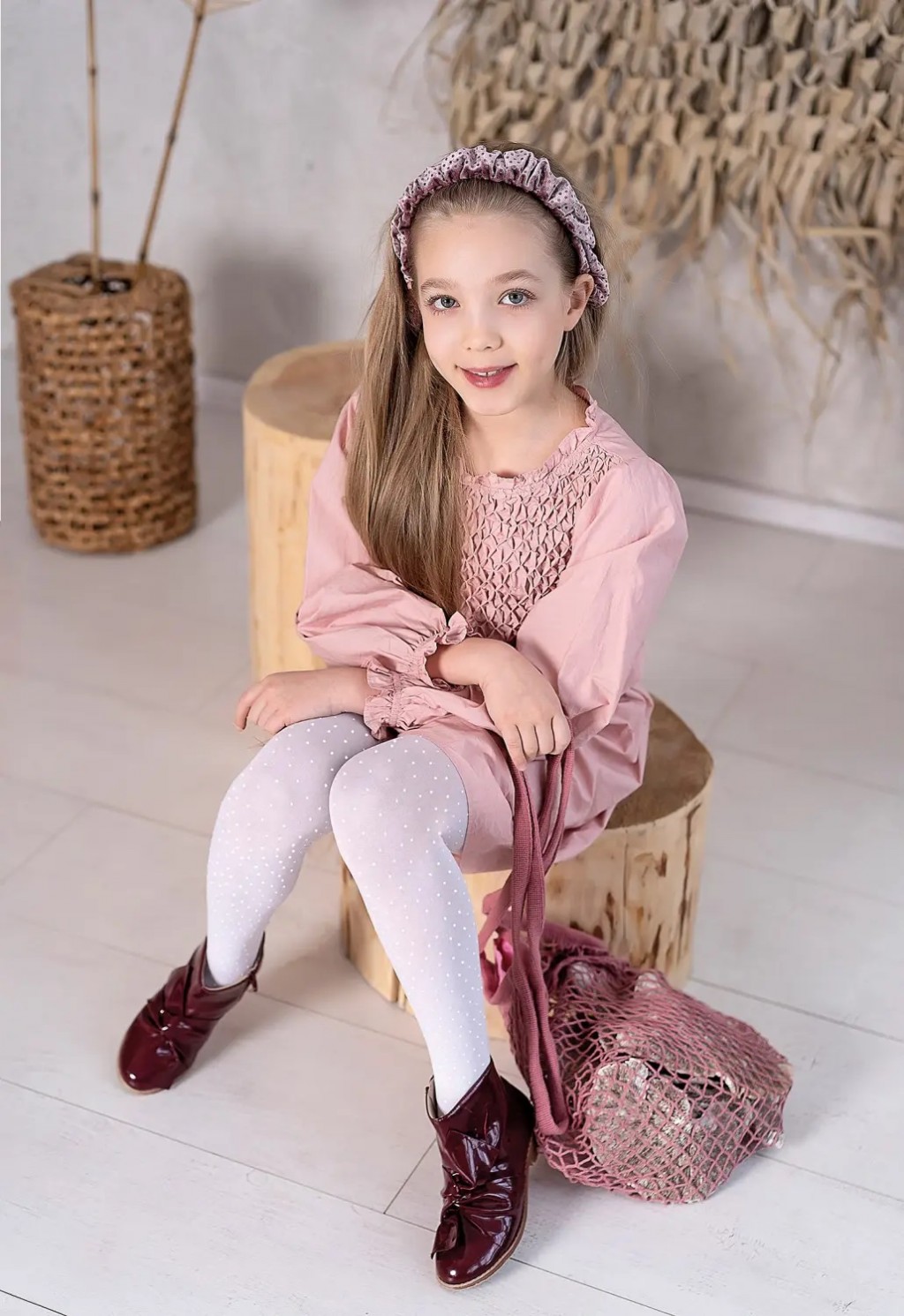 Rajstopy dziewczece z nadrukiem w kropki, wyprodukowane z miękkiej, kryjącej mikrofibry. Wydzielona część majteczkowa, bez klinu.