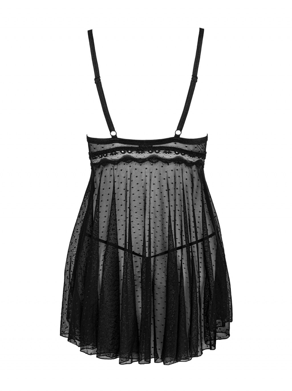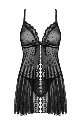 Ażurowa babydoll Marrbel w zestawie ze stringami. Zwiewny krój rozpinany w biuście – dodaje lekkości. Prześwitujący materiał – rozbudza wyobraźnię. Kokardka na biuście – uroczy element. Efektowne wykończenie koronki delikatnymi rzęskami – „eyelash”. Regulowane ramiączka – umożliwiają idealne dopasowanie. W zestawie pasujące stringi zdobione biżuteryjną zawieszką. Elastyczny i miły w dotyku materiał.