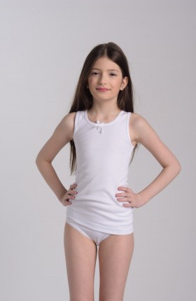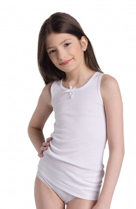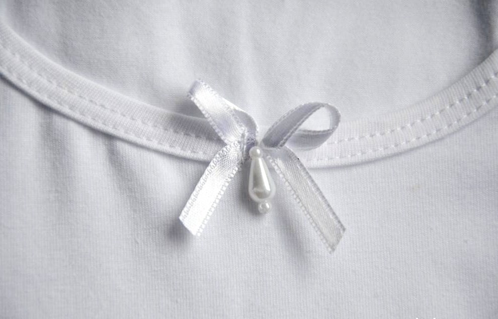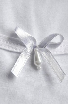Koszulka dziewczęca w kolorze bieli z półokrągłym dekoltem ozdobionym kokardką lub subtelnym haftem. Szerokie ramiączka, fason dopasowany do sylwetki. Przyjemna w dotyku dzianina. Idealnie sprawdzi się w sezonie komunijnym.