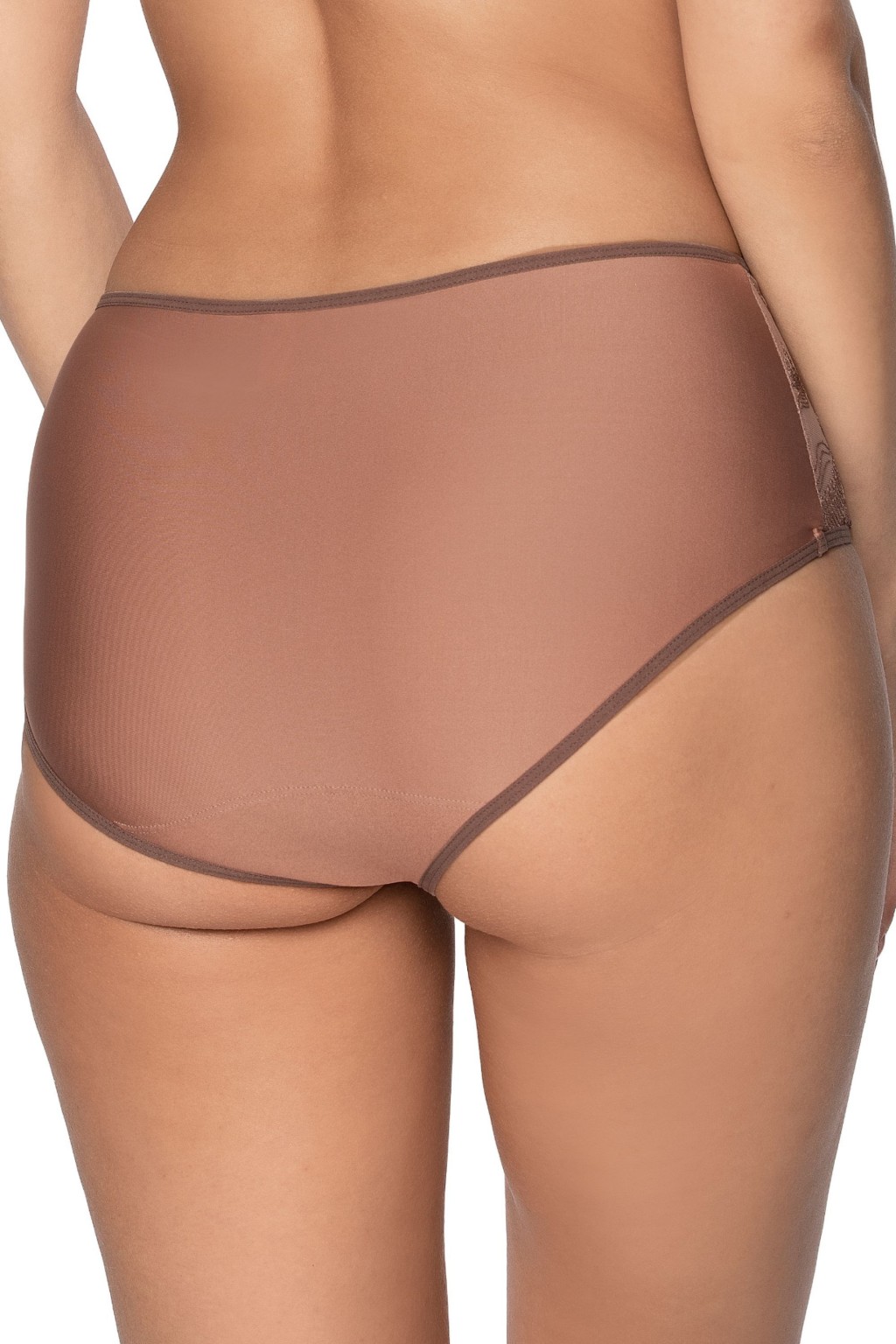 Szykowne figi damskie Lorena wykonane z przyjemnej, kryjącej mikrofibry w kolorze mocca. Przód z wstawkami z eleganckiej, kwiatowej koronki. Pas zdobi niewielka kokardka. Nogawki obszyte cienką tasiemką.