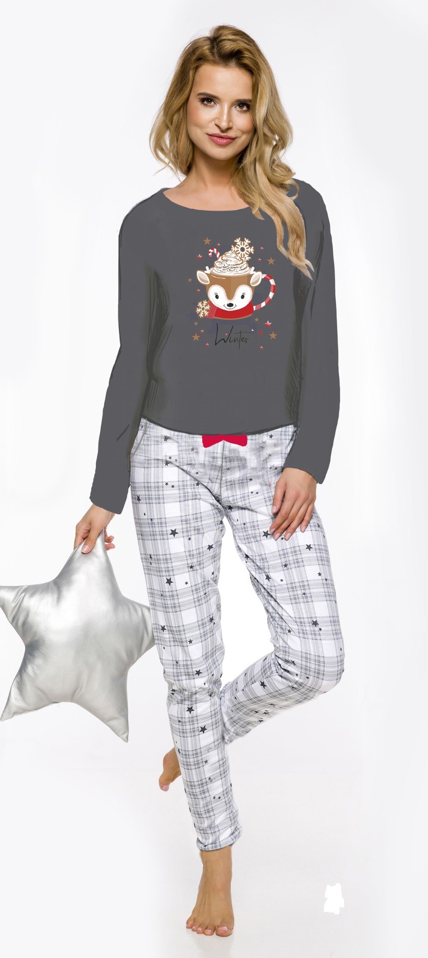 Piżama damska wykonana z wysokiej jakości bawełny. Koszulka z długim rękawem ozdobiona motywem świątecznym. Spodnie długie, wzorzyste z uroczą satynową kokardką.
