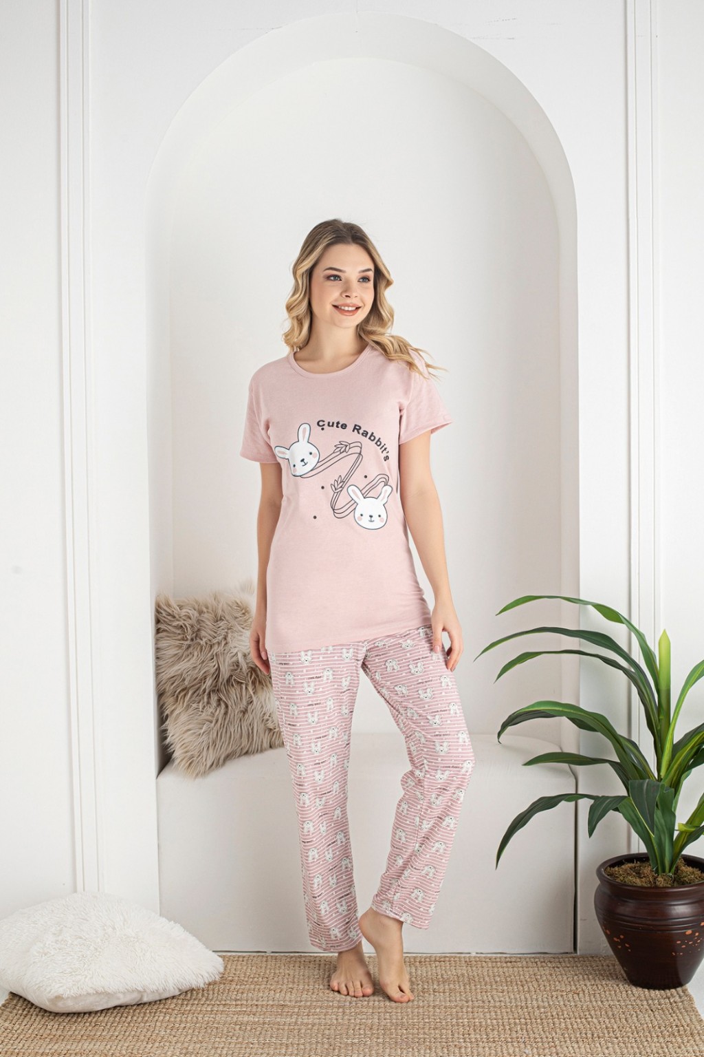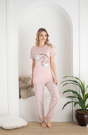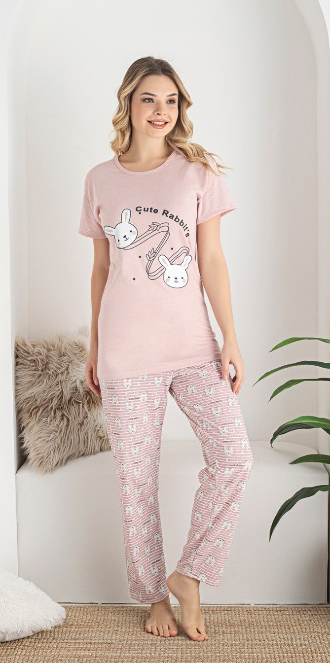 Piżama damska wykonana z bawełny. Góra piżamy z krótkim rękawem w kolorze różowym, przód ozdobiony nadrukiem uroczych króliczków. Dekolot półokrągły. Do kompletu długie, wzorzyste luźne spodnie w drobne paseczki i króliczki. W pasie wygodna guma.