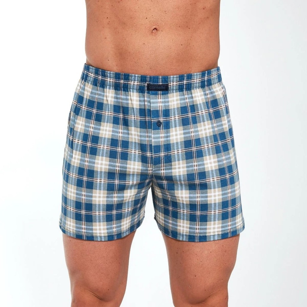 Luźne bokserki, które mogą być noszone jako bielizna dzienna lub nocna. Bokserki męskie w elegancką jeansowo-beżową kratę, zostały wykonane z wysokiej jakości bawełny. Materiał jest miękki w dotyku, delikatny dla skóry i przewiewny. Bokserki mają sprawdzony, luźny krój, dający pełną swobodę ruchów. Bokserki z rozporkiem są zapinane na guziczek. Bokserki są zapakowane w estetyczne pudełeczko, dzięki czemu sprawdzą się również jako praktyczny prezent.