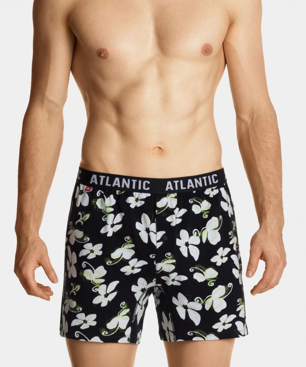 730054Wygodne bokserki męskie o luźnym kroju wykonane z wysokogatunkowej bawełny, która jest wytrzymała i odporna na wysokie temperatury. W 2-packu znajdują się granatowe bokserki - jedna para jednolita, druga ozdobiona białymi kwiatami hibiskusa. Bokserki mają uniwersalnej długości nogawki oraz niski stan wykończony szeroką gumą zewnętrzną, ozdobioną logiem firmy ATLANTIC. Guma jest miękka i nie powoduje uciskania ciała. Bielizna z przodu zapinana jest też na dwa guziki. Do wykonana bokserek wykorzystano 100% bawełnę, która jest przyjemna w dotyku ponadto ma zdolność wchłaniania wody, dzięki czemu zapobiega dyskomfortowi jakim jest nadmierne pocenie się ciała. Bokserki zapakowane w estetyczne pudełko. Sprzedaż całym opakowaniem - 2 sztuki. Cena dotyczy kompletu.