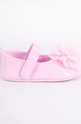 Urocze, dziewczęce balerinki w kolorze różowym. Gładkie, z połyskiem, dzięki czemu wyglądają bardzo elegancko. Dodatkowo ozdobione dużym, efektownym kwiatem z przodu bucika. Idealnie sprawdzą się podczas wszelkich uroczystości czy sesji zdjęciowych. Dzięki zapinanemu na rzep paskowi, idealnie dopasowują się do stopy dziecka.