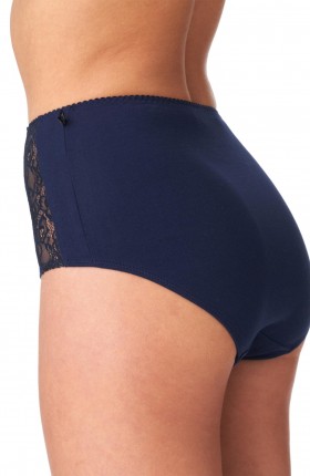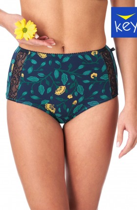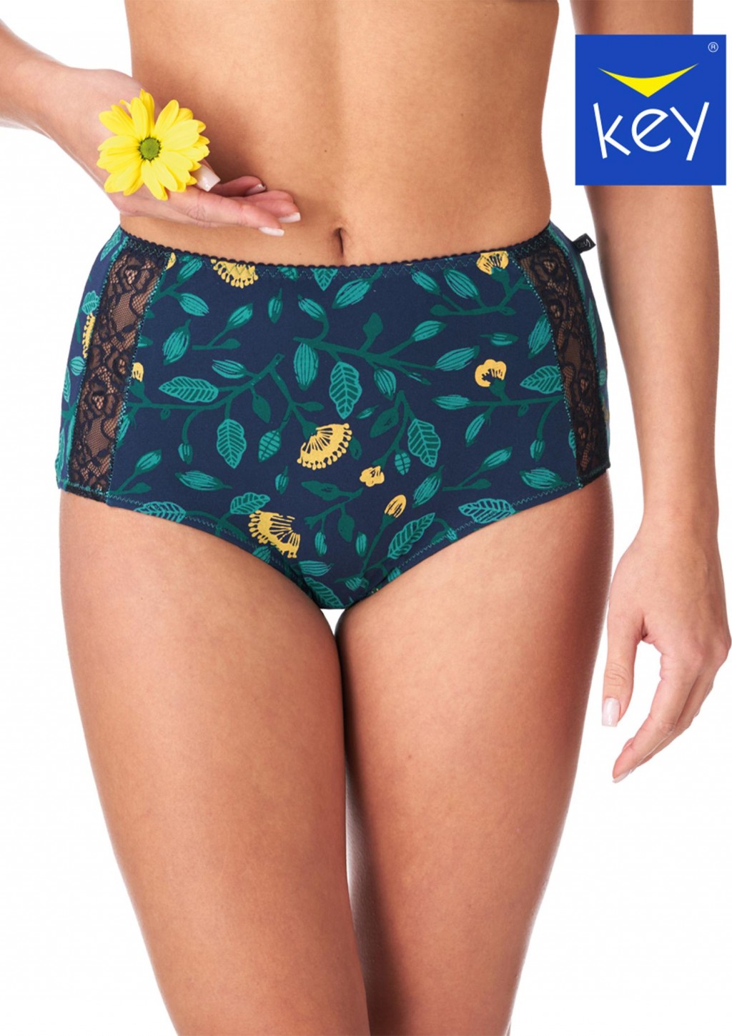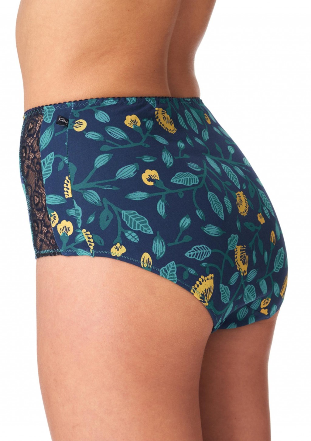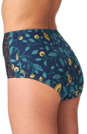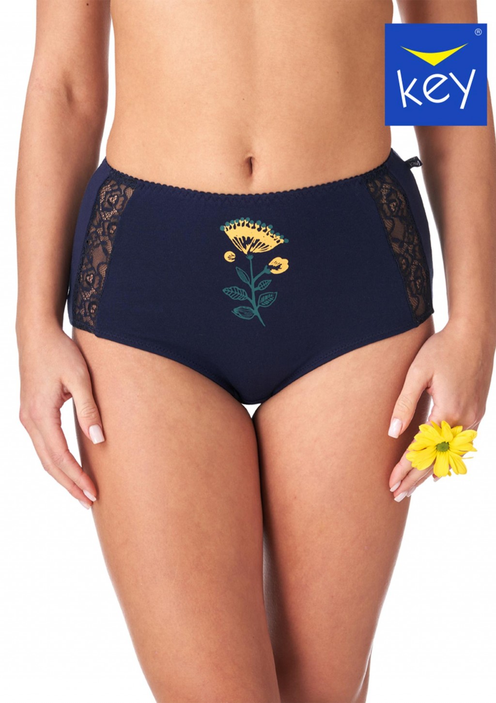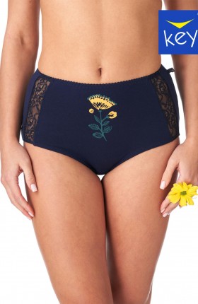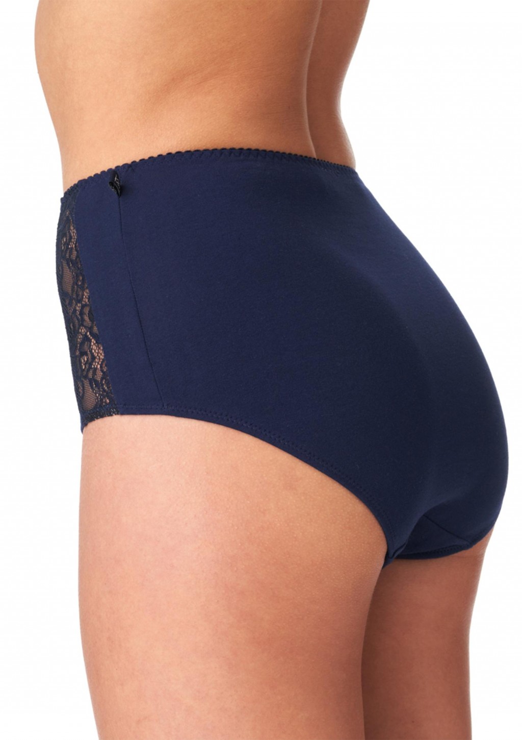 Majtki w stylu "maxi bikini" z wysokim stanem, który elegancko otula brzuch aż do pępka. Szerokie boki doskonale dopasowują się do bioder, brzucha i pośladków, optycznie wysmuklając sylwetkę. Delikatne wstawki z koronki dodają uroku. Model idealny dla każdej kobiety, szczególnie polecany dla tych o pełniejszych kształtach. W zestawie znajdują się 2 sztuki majtek: pierwsza granatowa gładka z delikatnymi koronkowymi wstawkami i subtelny wzorem, natomiast druga zachwyca roślinnym motywem na granatowym tle. Cechy produktu: krój "maxi bikini", wysoki stan, szeroki boki z delikatną koronką, wygodna gumka w pasie, idealne do pełniejszych kształtów.