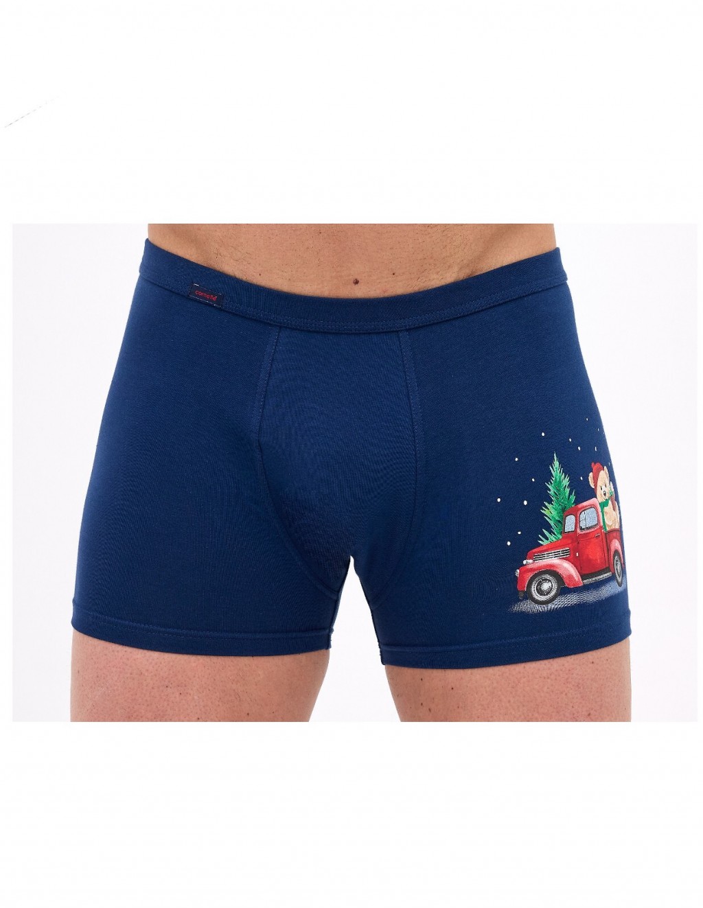 ● ozdobione uroczym nadrukiem misia jadącego czerwonym samochodem z choinką na dachu