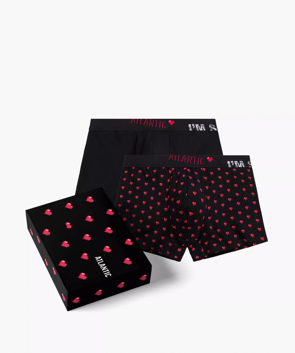 ● dwie pary obcisłych bokserek w czarnym kolorze: gładkie i ozdobione czerwonymi sercami