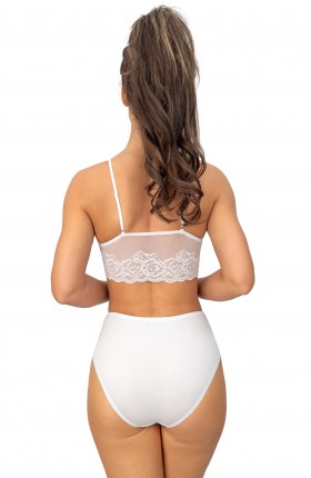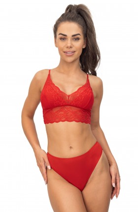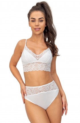 ● koronka o kwiatowym motywie zdobi miseczki i cały obwód
