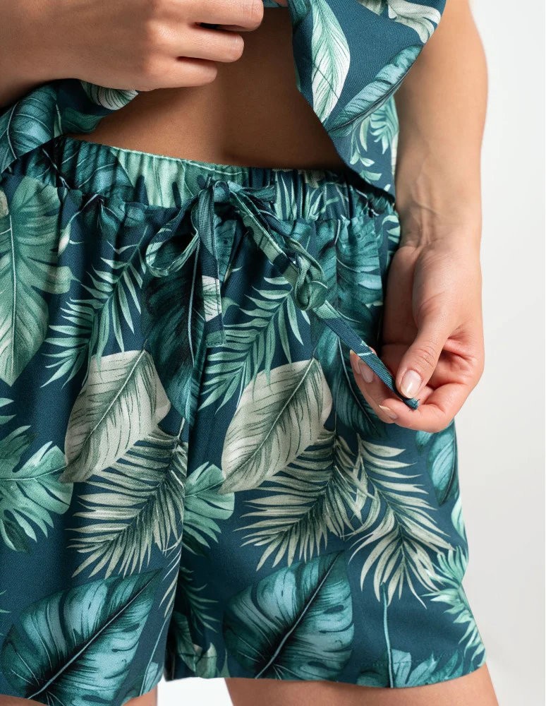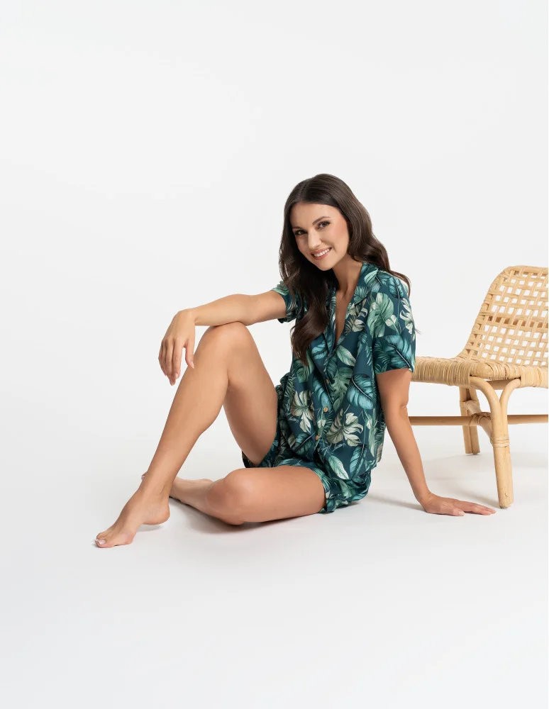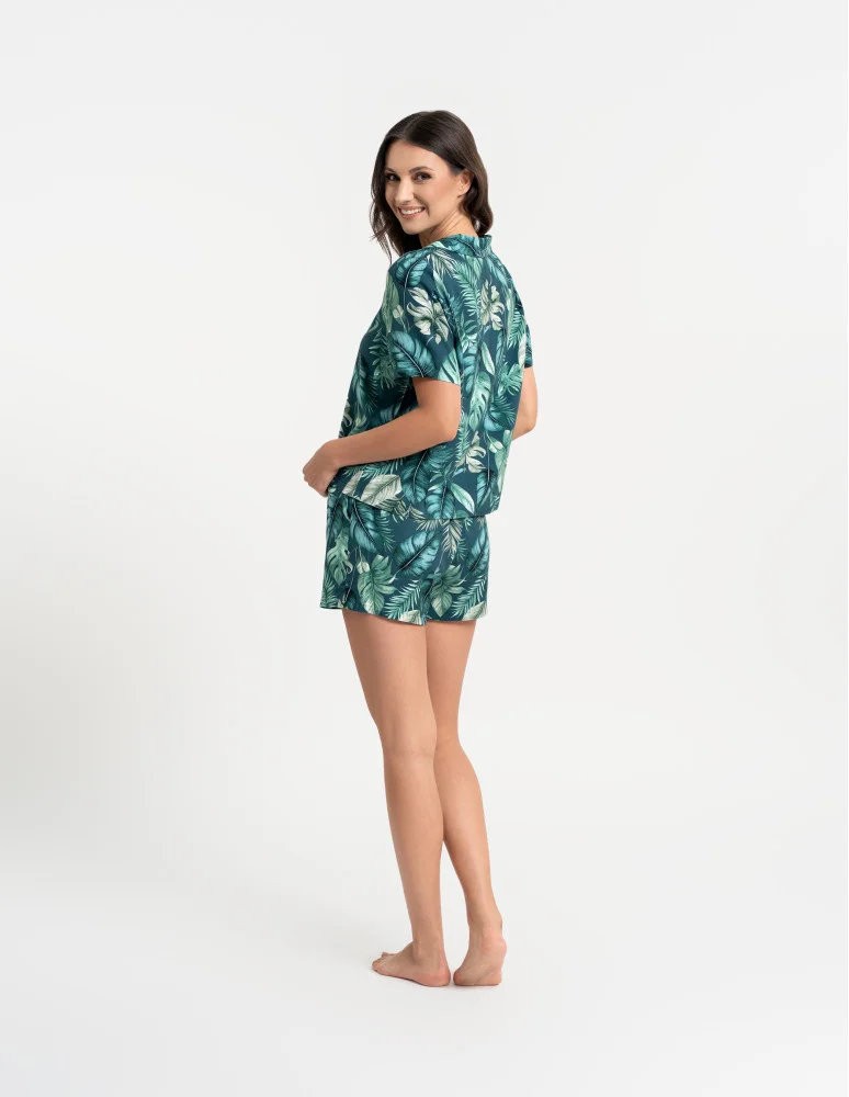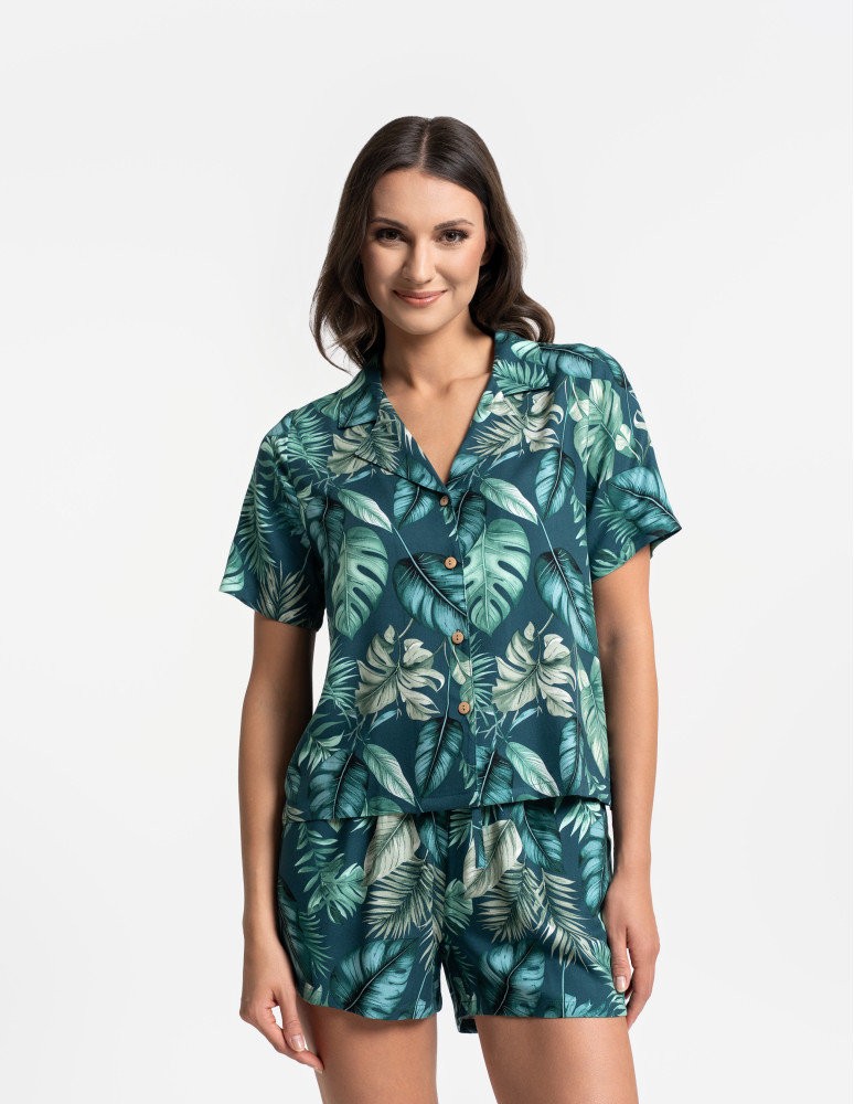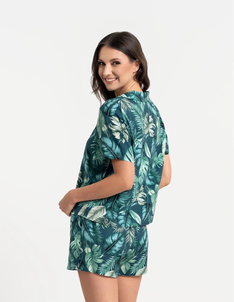 ● wzór z tropikalnymi liśćmi w odcieniach zieleni sprawia, że piżama jest stylowa