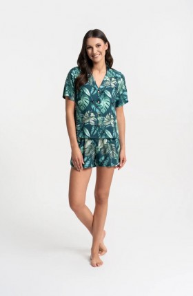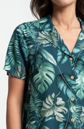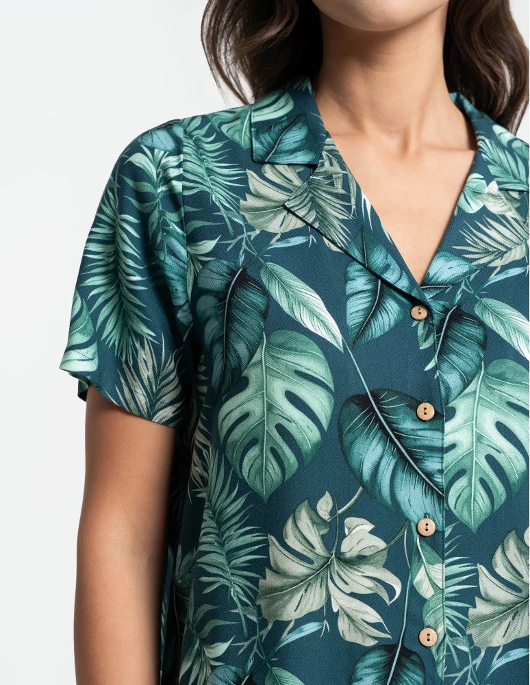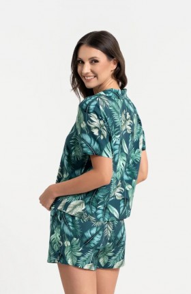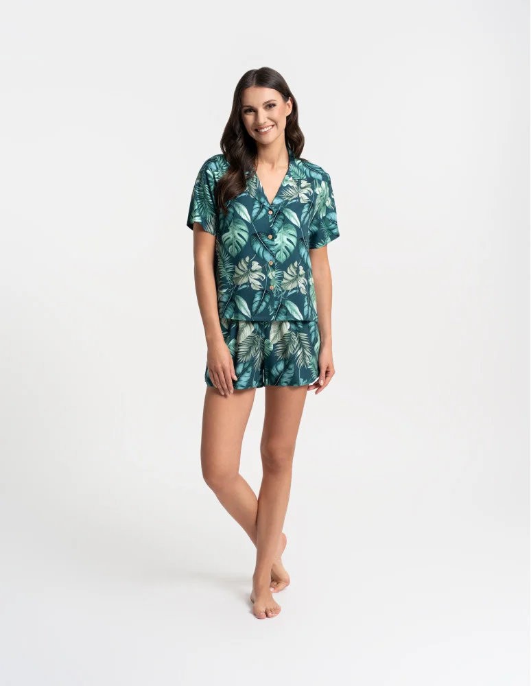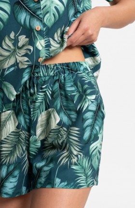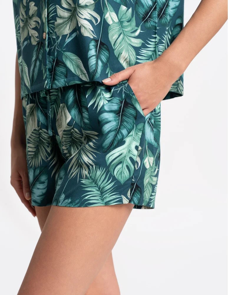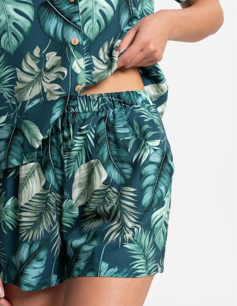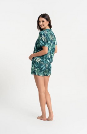 ● wzór z tropikalnymi liśćmi w odcieniach zieleni sprawia, że piżama jest stylowa