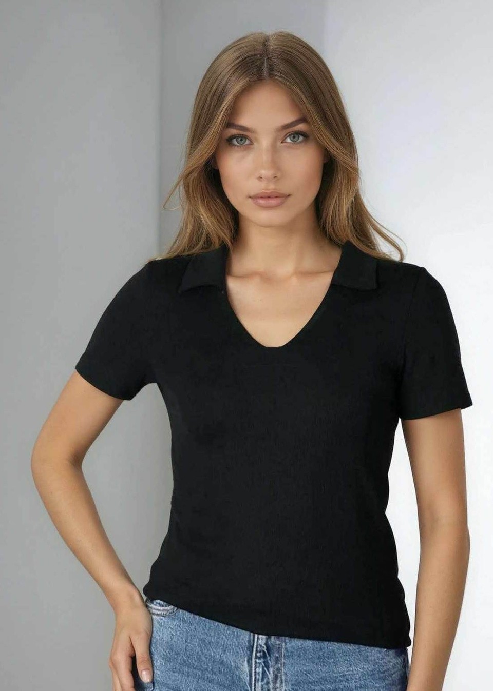 ● wyróżnikiem tego modelu jest stylowy kołnierzyk przechodzący w dekolt w serek (V-neck) bez guzików