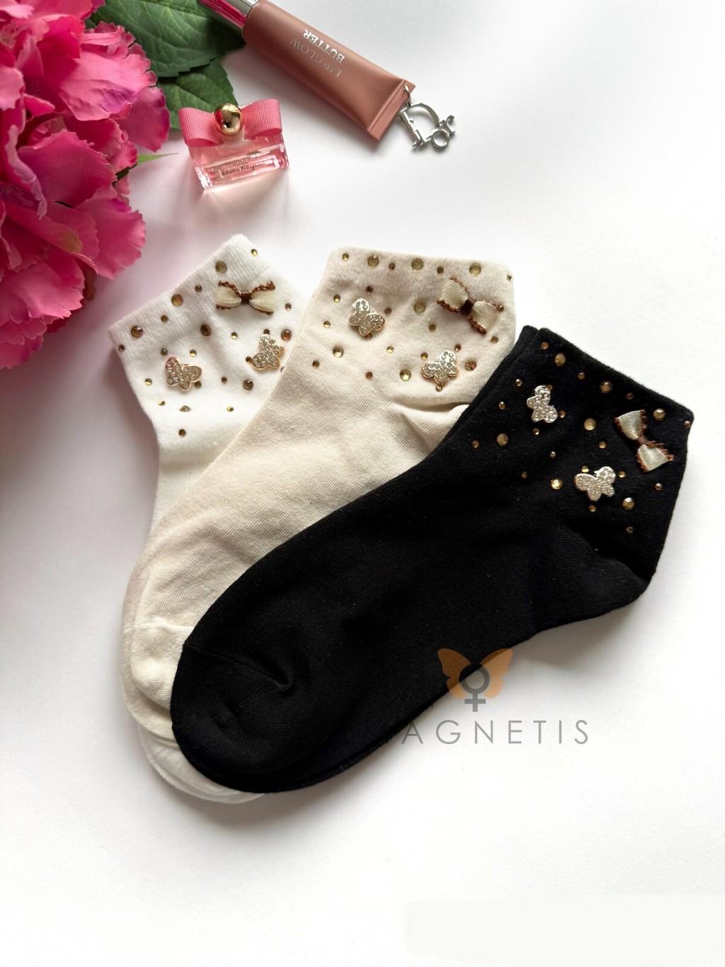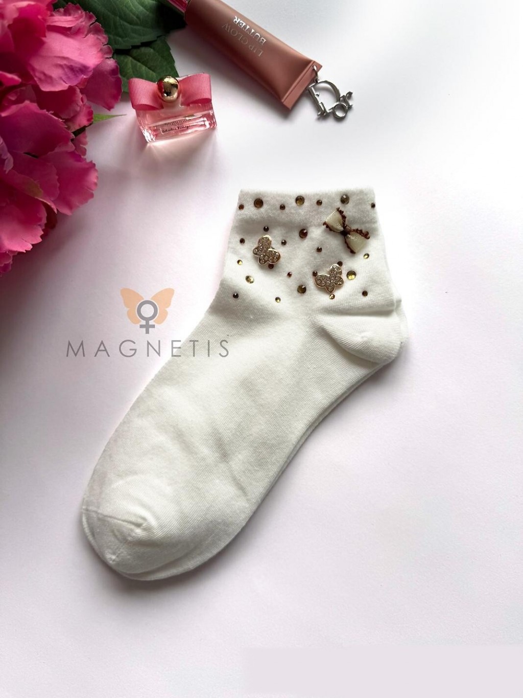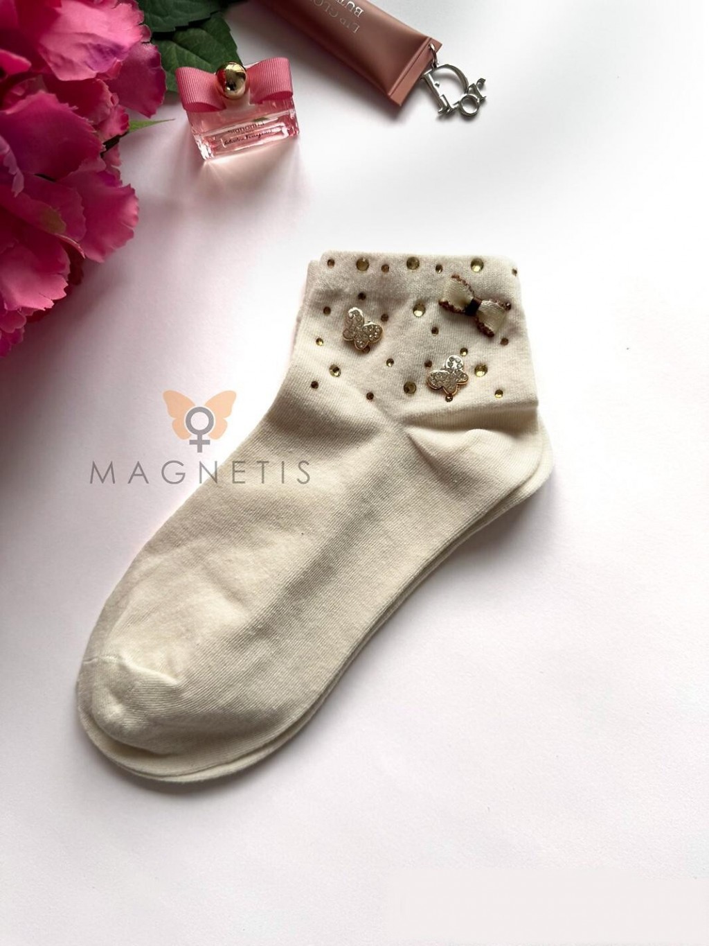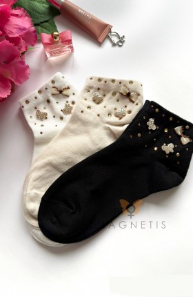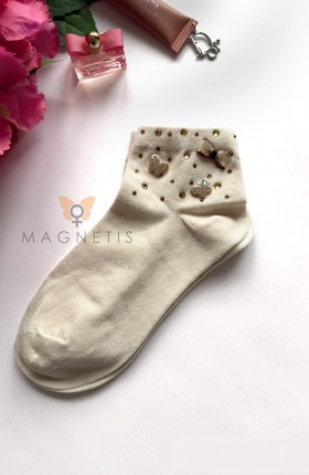 ● ściągacz zdobią naszyte połyskujące motylki, kokardka i cyrkonie