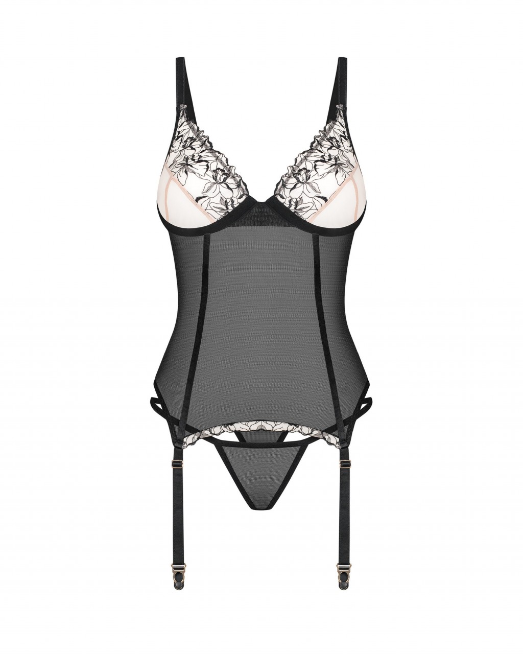 ● elastyczny mesh zestawiony z beżowym tiulem ozdobionym floralnym haftem