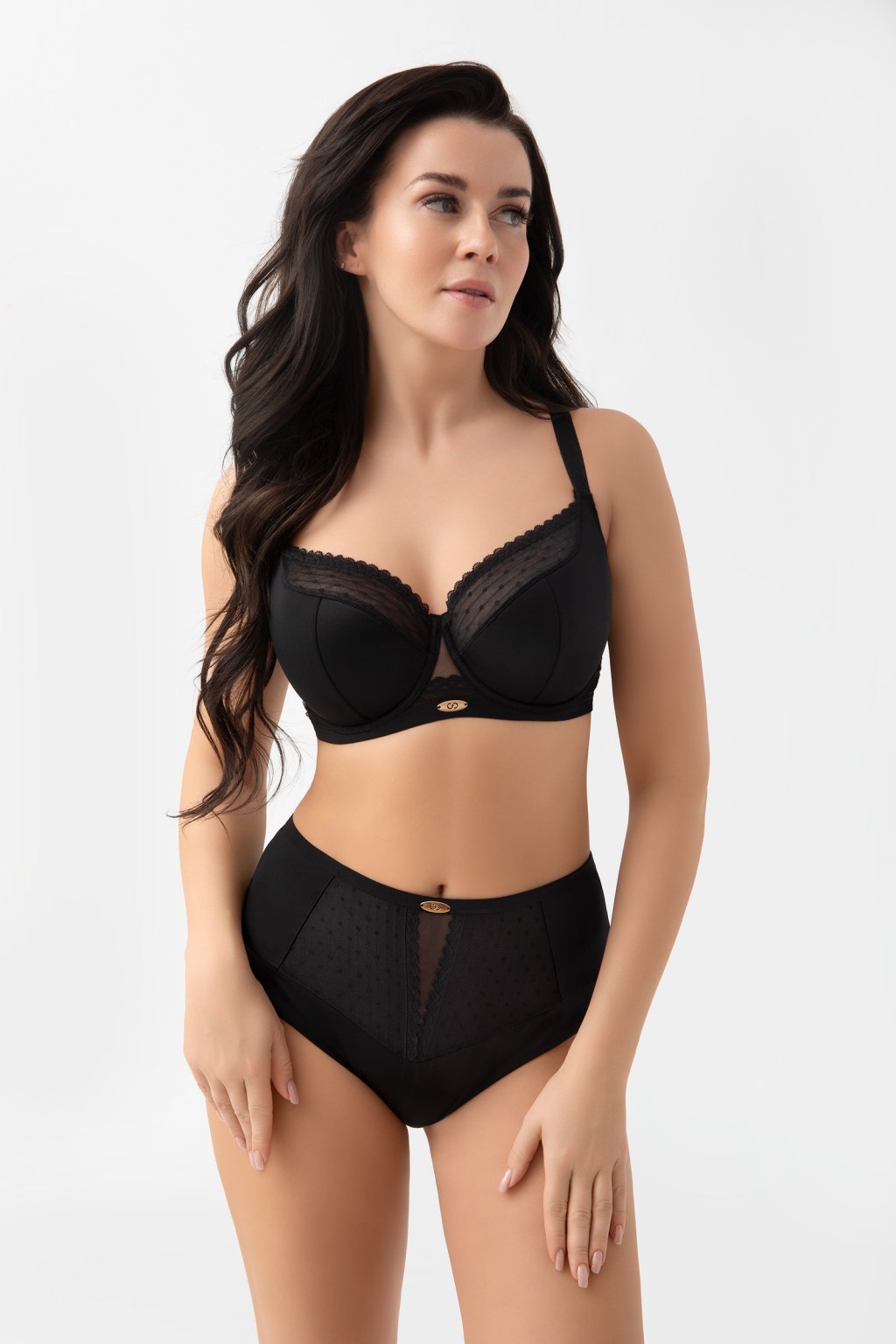 G021 DOTTI FIGI Wykonane z połączenia kryjącej mikrofibry, koronki oraz tiulu elastycznego. Tył majtek uszyty z tiulu elastycznego i wykończony na gładko, dzięki czemu model nie odznacza się pod ubraniem. Metalowe elementy w kolorze light gold bez niklu - ozdobny element z logo marki. Wyposażone w bawełniany kroczek dla pełnego komfortu.
