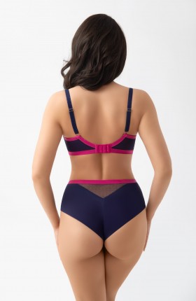G022 SAVINA BRAZYLIANY Majtki typu brazyliany charakteryzujące się połączeniem kryjącej mikrofibry na przodzie z tiulem elastycznym, koronką kabaretką i haftem. Tył wykonany z tiulu elastycznego i wykończony na gładko zapewnia pełną dyskrecję i brak odznaczających się krawędzi pod dopasowaną odzieżą. Szwy modelu są estetycznie przykryte ozdobnymi taśmami. Posiadają bawełniany kroczek dla pełnego komfortu.