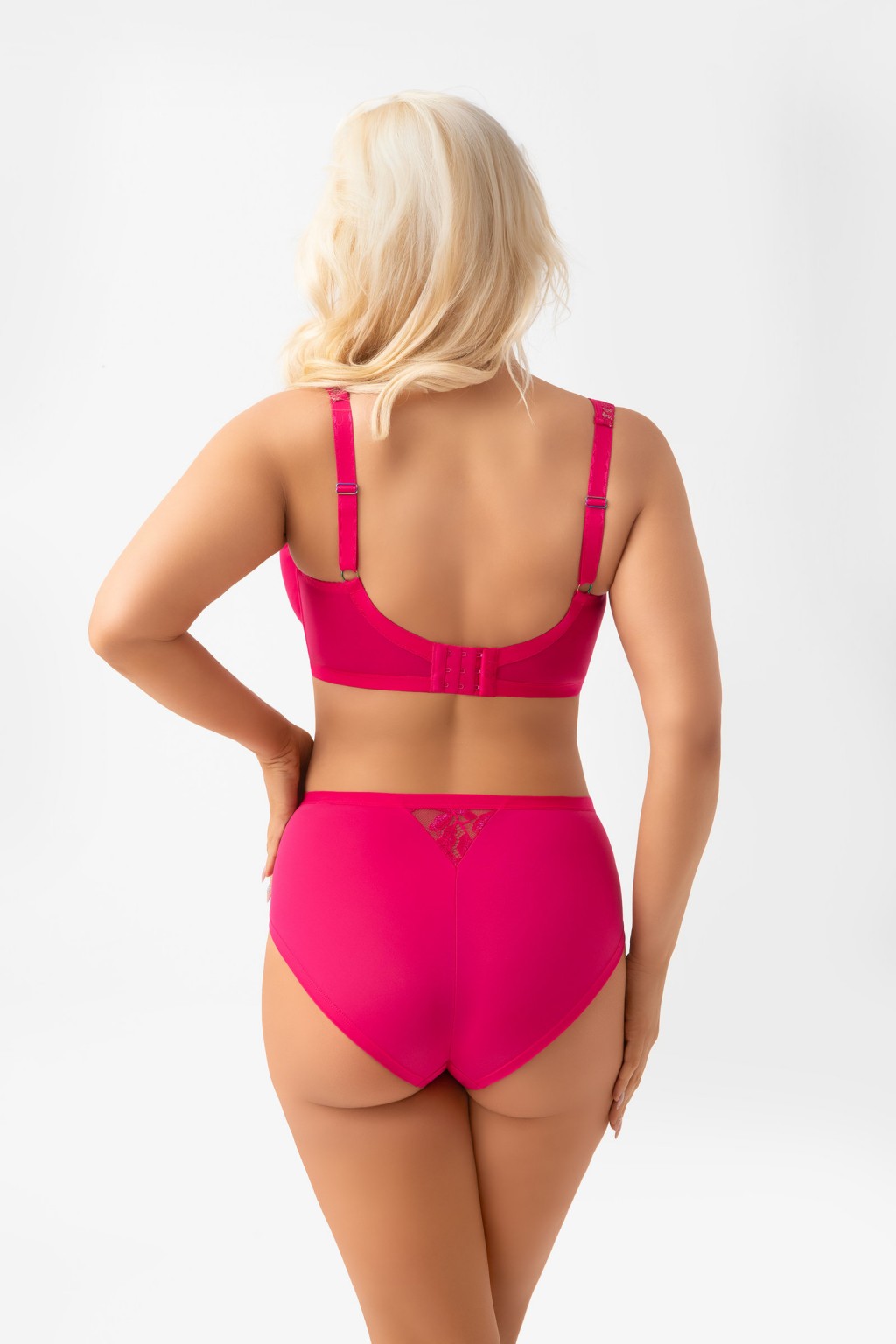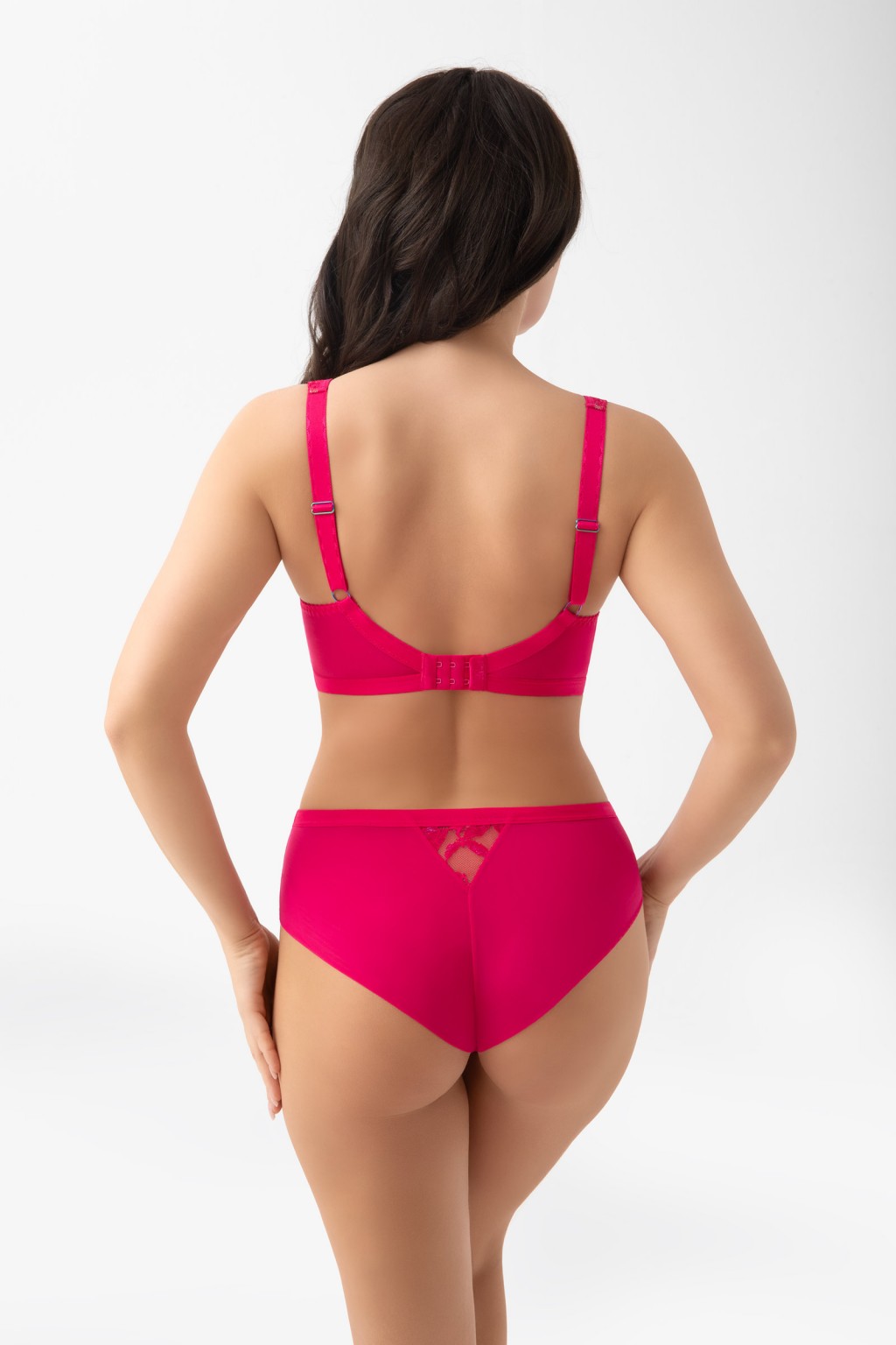 G029 AMARIS (konstrukcja K638 VENEZIA) Biustonosz miękki przeznaczony dla kobiet ze średnim oraz dużym biustem. Miski wykonane z tiulu stabilnego oraz połyskującej koronki, natomiast panel boczny z kryjącej dzianiny typu simplex. Dolna krawędź pasa obwodu została wykończona miękkimi lamówkami, co znacząco podnosi komfort noszenia. Model wyróżnia się zastosowaniem szerokich ramiączek z pianki i koronki, których zadaniem jest odciążenie ramion i kręgosłupa. Tył wykonany z kryjącej lycry zapewnia stabilne podtrzymanie, a fiszbiny boczne zapobiegają zwijaniu się materiału. Haftki są obleczone mikrofibrą i posiadają trójstopniową regulację obwodu (dwu- lub trzyrzędowe w zależności od rozmiaru). Nieodpinane, regulowane ramiączka występują w dwóch szerokościach (18,22). Metalowe elementy multicolor nie zawierają niklu – ozdobny element z nazwą marki.