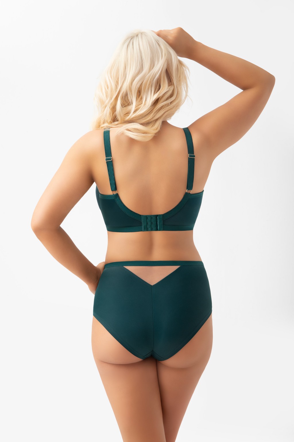 G034 AISHA (konstrukcja K630 MORISSON) Biustonosz miękki przeznaczony dla kobiet ze średnim oraz dużym biustem. Konstrukcja z 4-częściowym podziałem misek (górna, przednia, środkowa i panel boczny typu side support) zapewnia efekt zaokrąglenia dolnej części biustu oraz skuteczne zebranie piersi do środka od strony pachy. Dolne części misek oraz panel boczny wykonano z kryjącej dzianiny simplex, natomiast górną część z haftu na tiulu stabilnym. Linia dekoltu została podniesiona i wymodelowana tak, aby bezpiecznie zamykać całość konstrukcji. Dla maksymalnej wygody górna i dolna krawędź pasa obwodu wykończona została miękkimi lamówkami. Tył z lycry gwarantuje stabilne podtrzymanie, a fiszbiny boczne zapobiegają zwijaniu się materiału. Haftki obleczone mikrofibrą, dwu- lub trzyrzędowe z trójstopniową regulacją. Nieodpinane, regulowane ramiączka występują w czterech szerokościach (14,18,22,25). Metalowe elementy w kolorze light gold bez niklu, zdobina na ramiączka z zielonym kamieniem (oczkiem).