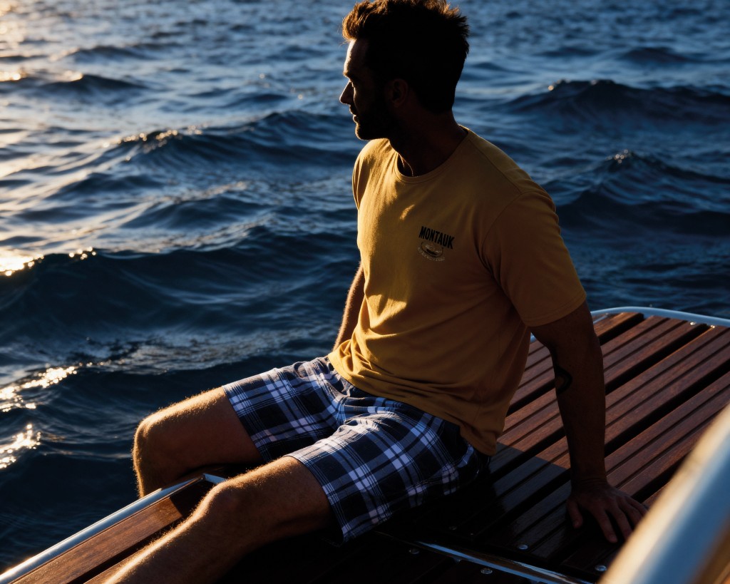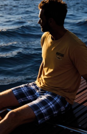 ● krótkie spodenki w ponadczasową, klasyczną kratę doskonale równoważą wyrazistą górę