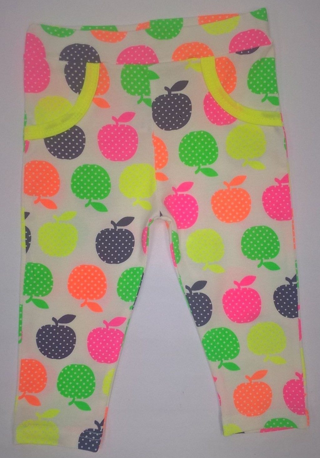 Kolorowe leginsy dziewczęce zostały wykonane z miękkiej bawełny. Leginsy 3/4 ozdobione printem w jabłka.