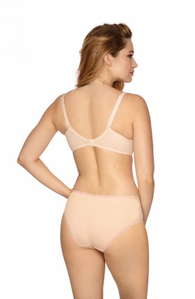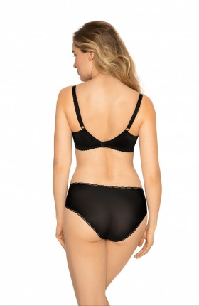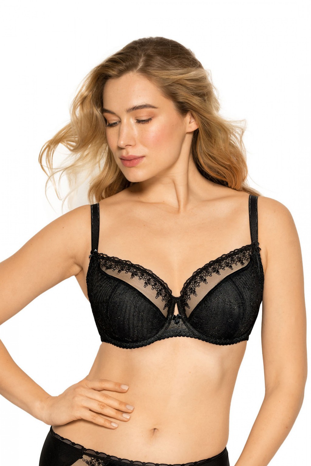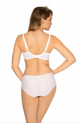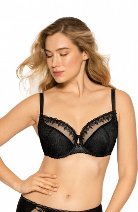 516385Niespotykany półusztywniany model o konstrukcji SS4. Górną miseczkę stanowi bardzo subtelny eteryczny haft z pięknym wykończeniem. Usztywniona miska dolna, środek i boczki wykonane z haftowanego plenu. Plecy odcinane z gładkiej Lycry. Konstrukcja z pogłębionymi miseczkami oraz podwyższonym środkiem który przylega do mostka. W tym modelu zastosowane zostały boczne fiszbiny. Biustonosz ten pięknie układa się na ciele. Na uwagę zasługuje środek o unikatowym wyglądzie, miseczki wspaniale podtrzymują piersi nadając im okrągły kształt. Na środku i na ramiączkach małe kokardki. Bielizna stworzona dla pań ceniących klasyczny kolor połączony z nowoczesnym projektem.